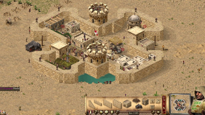 The Sentinel's castles are always constructed in the shape of the Maltese Cross, the symbol of the Knights Templar. They are sprawling large crosses with a confined interior, which take quite a while to build, but are considerably defensible. The keep is bordered by thick walls, moat and Gatehouses in the corners. Various large towers are constructed in opposite edges, which house Tower Mangonels and Ballistae. Small groups of Crossbowmen are spread out to repel unwanted intruders. The castle bailey gives safe shelter to most of the Sentinel's industry and Hovels. The Sentinel tends to address harassment with a band of Pikemen and Crossbowmen, but tends to forgo patrolling his economic buildings.