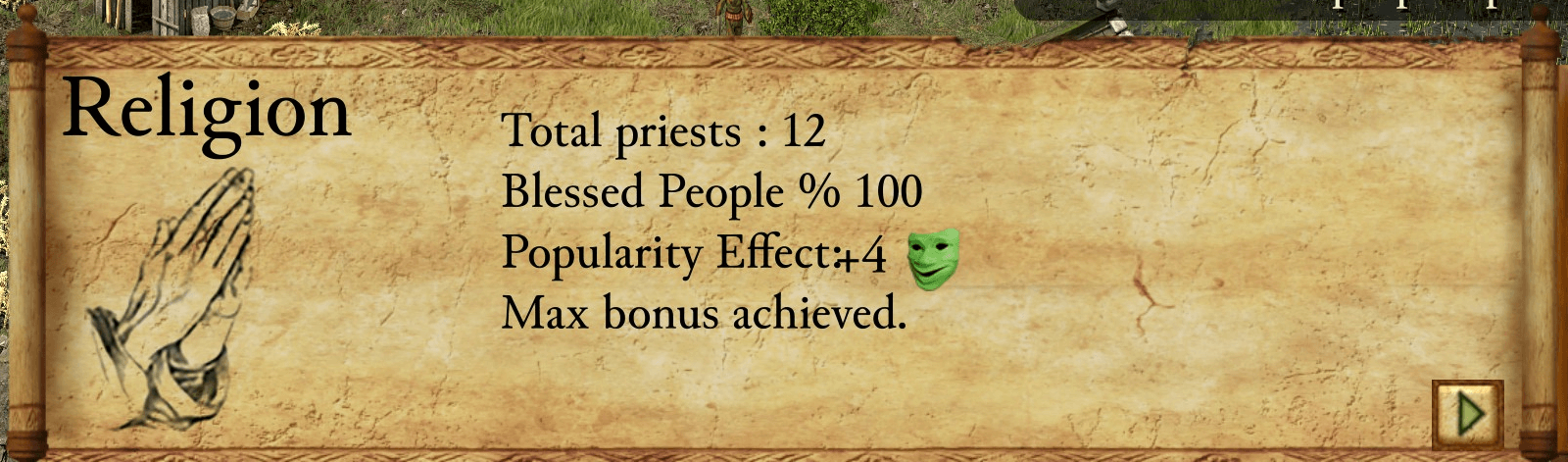 First off the player can observe the current religious situation in his castle by opening the religion panel from the advisor's report menu, there he can see the number of priests, percentage of blessed people, the bonus you are receiving to popularity as well as the next percentage milestone.