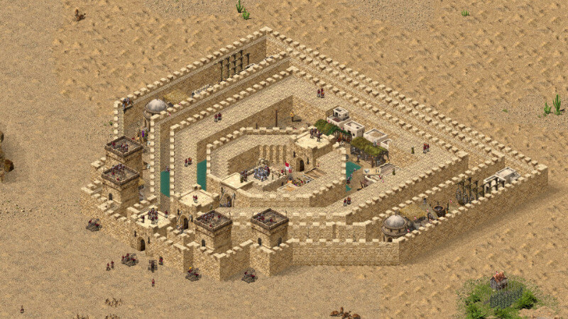 Borrowing inspiration from the game's title, The Wolf constructs elaborate strongholds that are usually complex in design and take up vast real estate. Virtually every tower and defensive measure is utilised in order to repel attacking armies. Thick crenellated walls, sometimes in multiple layers enclose The Wolf's Keep, including massive Square Towers, which host plenty of Crossbowmen, Archers and Mangonels with Ballistae. Moat and Pitch alongside with hidden Killing Pits are commonly built in large numbers, with Trebuchets and Fire Ballistae deployed on the field to oversee the outer perimeter. The Wolf's industry is usually built inside of the castle, with a few designs including the buildings in outside positions. The Wolf's keep is seen teeming with armored units, gradually forming up for an almost impenetrable defense for the Lord, until venturing out for an enemy of his choosing. Arabian Bowmen and Pikemen are seen to handle provoking small forces.