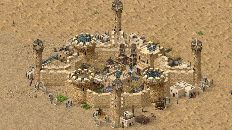 The Emir builds a large, densely built enclosure in the shape of an octagon. The walls are considerably thick with crenellations on the outside, further strengthened by Round Towers and protruding Lookout Towers. There is usually only one entrance through a large gate. The Emir places Arabian bowmen and Archers on top of all his stone structures, sometimes with supporting Oil Engineers present. A Mangonel or two are placed in some of the large towers to take potshots at advancing enemy ranks. The bulk of the Emir's processing industry is built inside the large castle courtyard, while there are additional services placed outside along with Good Things and most recruitment buildings. The Keep collects a lot of Arabian Swordsmen, as well Horse Archers around of the campfire, who daringly strike out at close enemies.