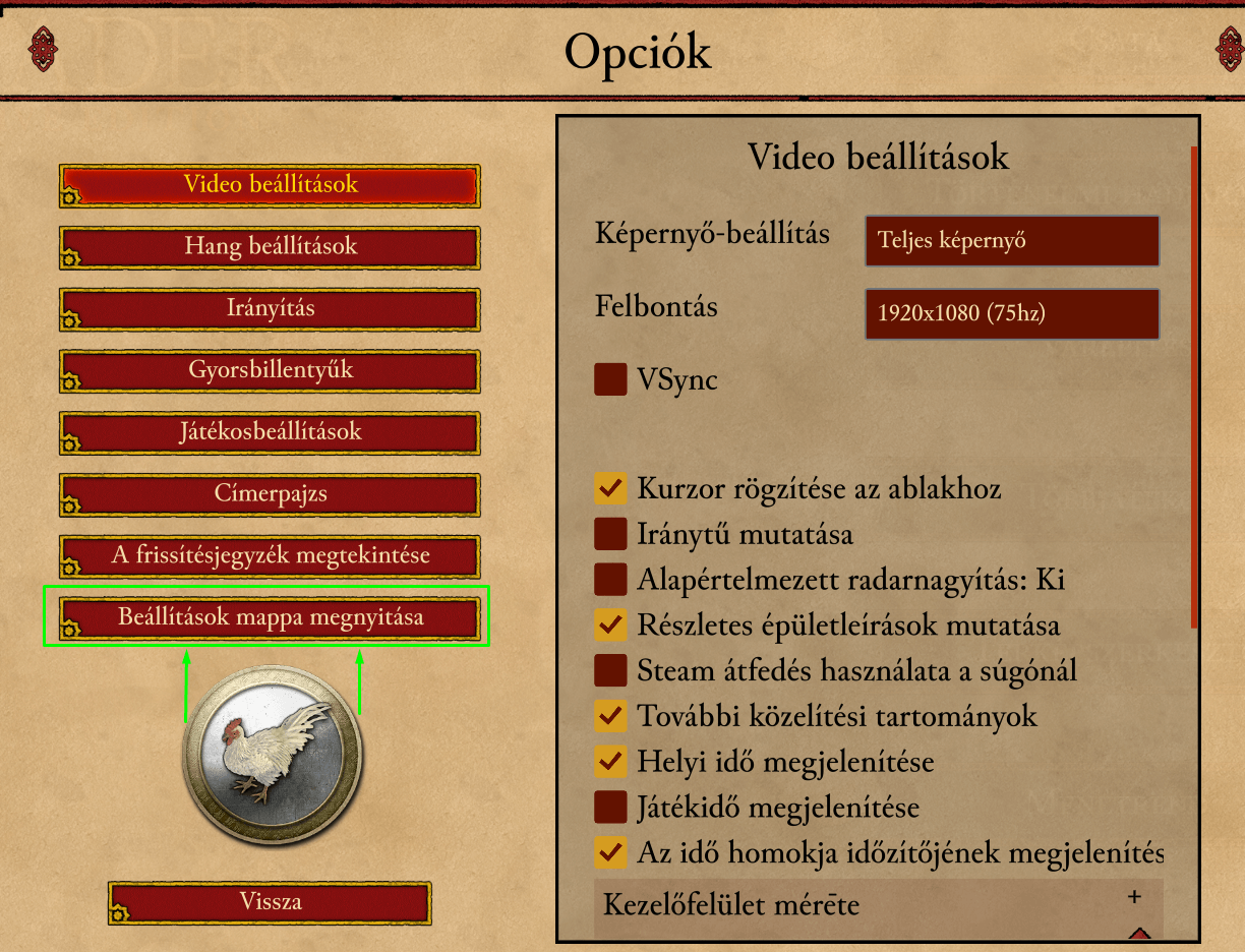 After this, launch SHC:DE and after you are greeted by the main menu, click on the Settings button right of the Firefly logo, then click on "Open Settings Folder" just above the chicken (excerpt from the Hungarian version).