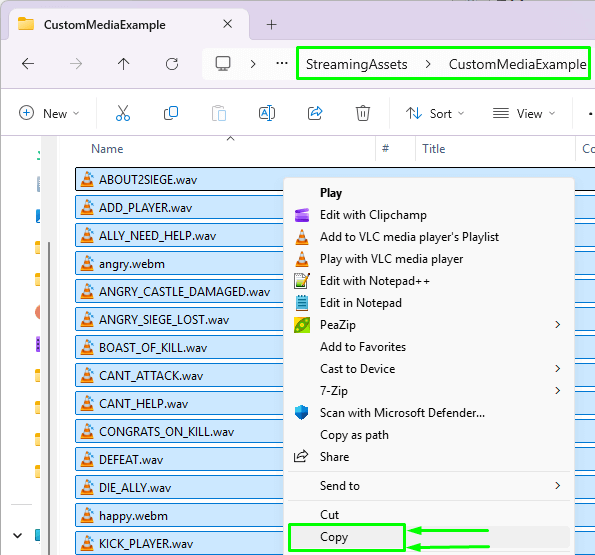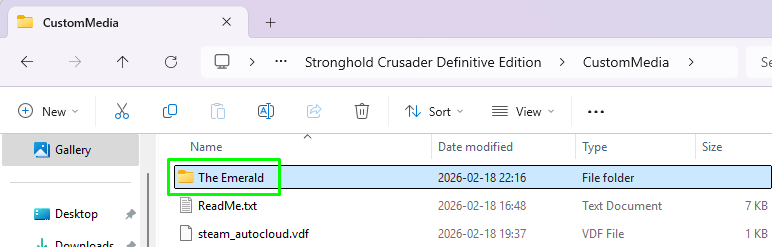 Open the folder "Stronghold Crusader Definitive Edition_Data", then "StreamingAssets", finally "CustomMediaExample" within. Select all files and copy them to the folder "The Emerald" shown in the other File Explorer window. If you did everything right, the copied contents will land exactly there: voice lines, video clips and subtitles.