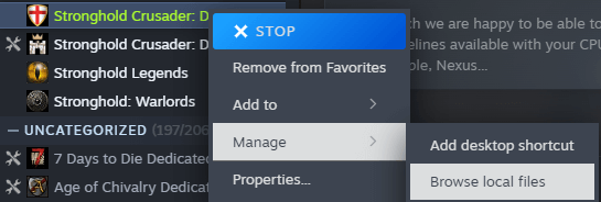 Then, right-click the Definitive Edition's entry in the Steam game library, click on "Manage" in the context menu popping up, then choose "Browse local files". This will take you to the installation location of SHC:DE on your hard drive, opening yet another File Explorer.