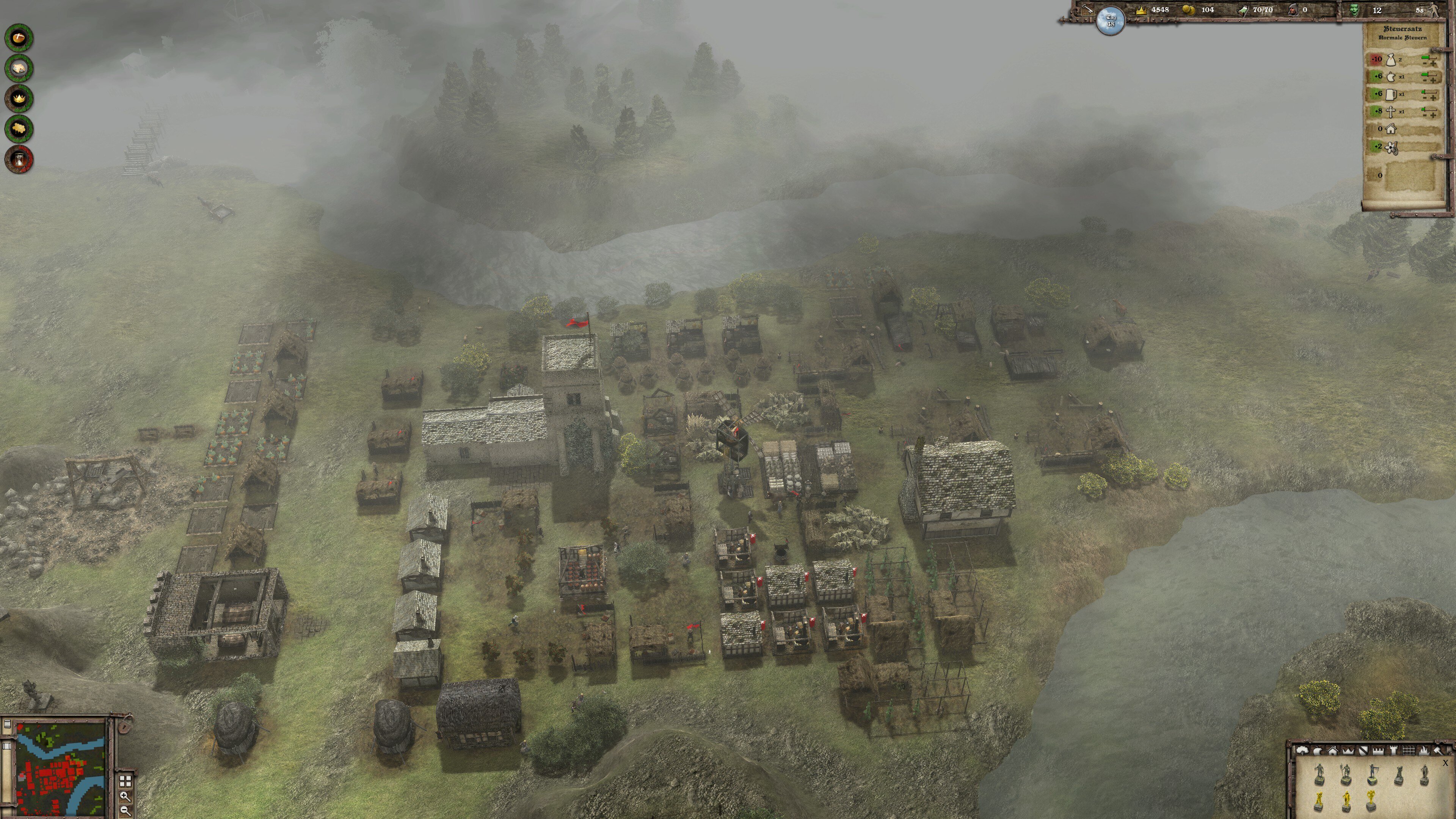 First thing I did was to buy as many crossbows and leather armours as possible then sending my new crossbowmen to the rat's keep. The rat is basically useless but his keep makes for a great defensive structure. This should help keep the rat alive and the nomads distracted. I also fortified the river with a gatehouse and crossbowmen. Really crossbowmen were the key to beating the nomads here. This is what my castle looked like once things were pretty stable. Not very impressive or pretty but it did the trick. -