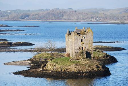 Castle Stalker is located on an outcropping on Loch Laich, - in Port Appin, Argyll, Scotland. Classed as an “Island Castle”, it is completely surrounded by impassable water when The Loch us at high tide. Built in 1320, it was originally a wooden fortification, later conveyed to stone (1322), Castle Stalker was the seat of power to The Clan MacDougall. These were Highland Nobles, who were against The Bruces during The Scottish Civil Wars. As a result, The Clan MacDougall abandoned Castle Stalker. In 1388, The Stewarts took control until the 18th Century. It sat in ruins until purchased in 1908. It has been moderately restored to it’s 15th Century appearance. Castle Stalker was never besieged or Slighted. It is a Central Keep (Tower House), which is 4-Stories tall. The majority of “Castle Life ” there included Living Quarters, Kitchens and Armory. The walks are made of regional stone, roughly 6-feet thick. Outer buildings such as Stables and other ancillary structures may also have existed, as evidenced by existing foundations. At some point, despite it’s natural water defenses, a small Perimeter Wall may have existed in the 15th Century. This may have been 6-feet tall and 3-feet thick. It has long since vanished.